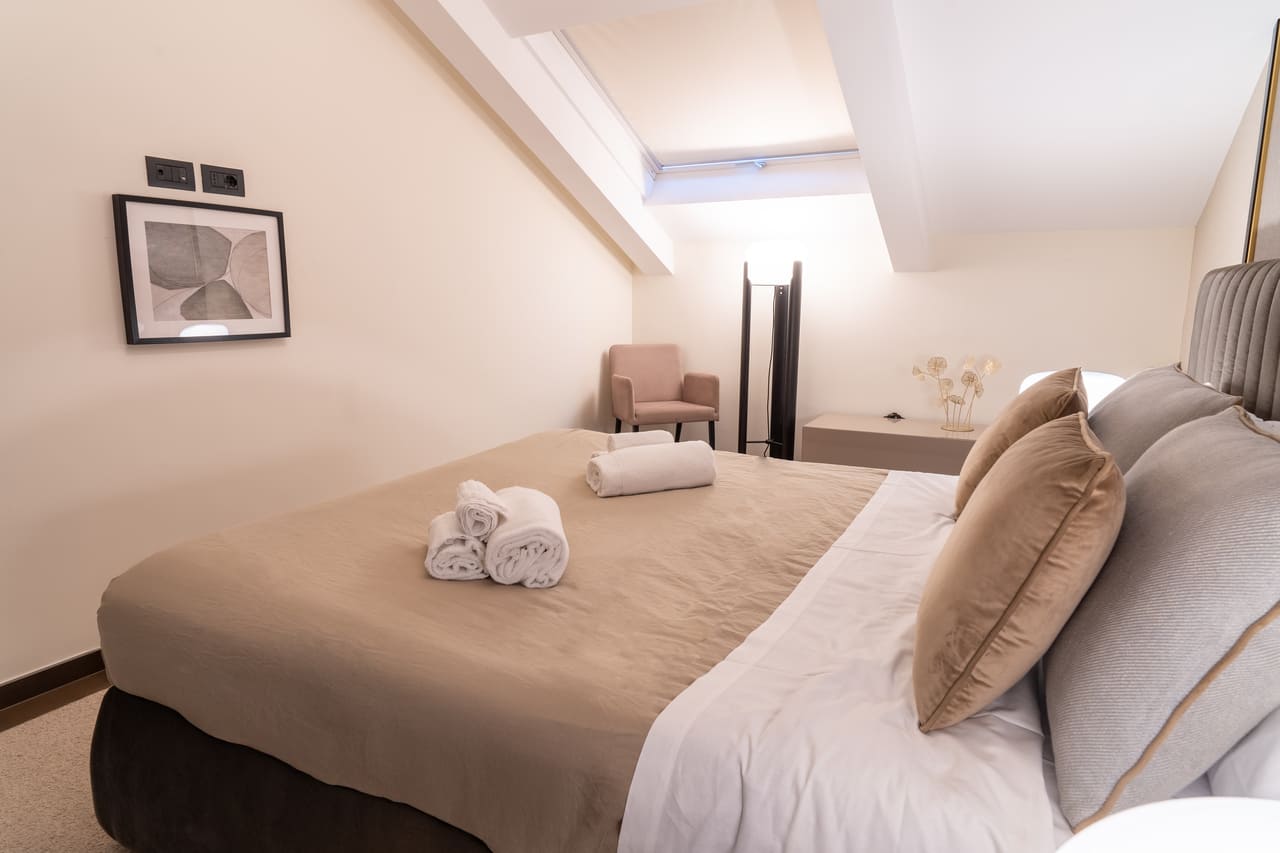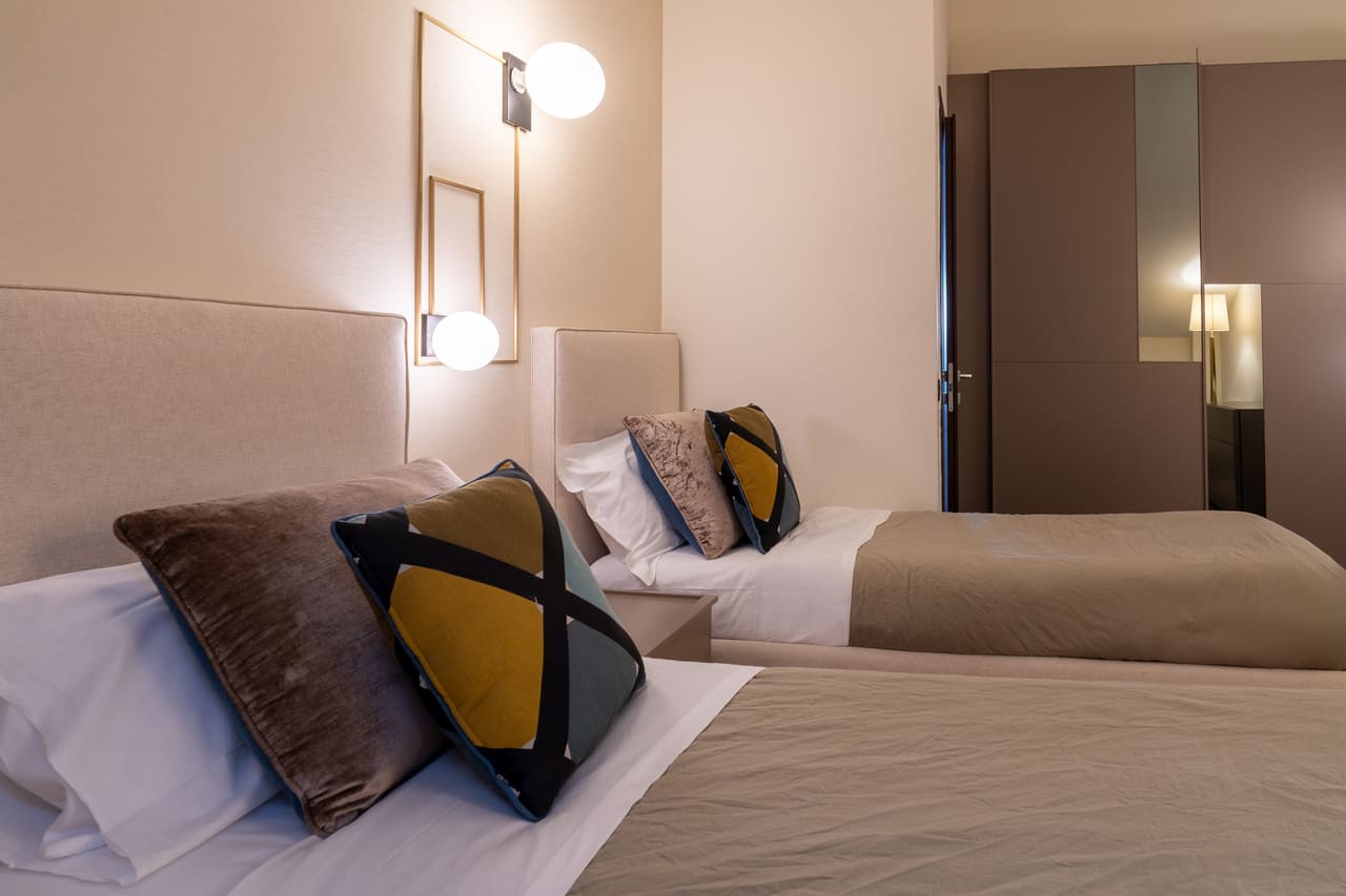 Posizionato al sesto piano, la struttura, offre un appartamento di 45m², articolato in tre vani: un accogliente soggiorno dotato di divano, una camera doppia con due letti singoli e una camera matrimoniale con letto a due piazze.
